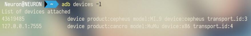 使用此命令以列出所有当前连接至此计算机的Android设备和此电脑上的Android模拟器,您可以添加-l参数以显示设备的详细信息。第一列显示的是设备的序列号。