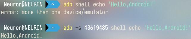 如果您的计算机上连接了多个Android设备或模拟器,您需要在发送命令时使用-s参数指定目标设备,否则会抛出错误。在-s参数后加上目标设备的序列号。
